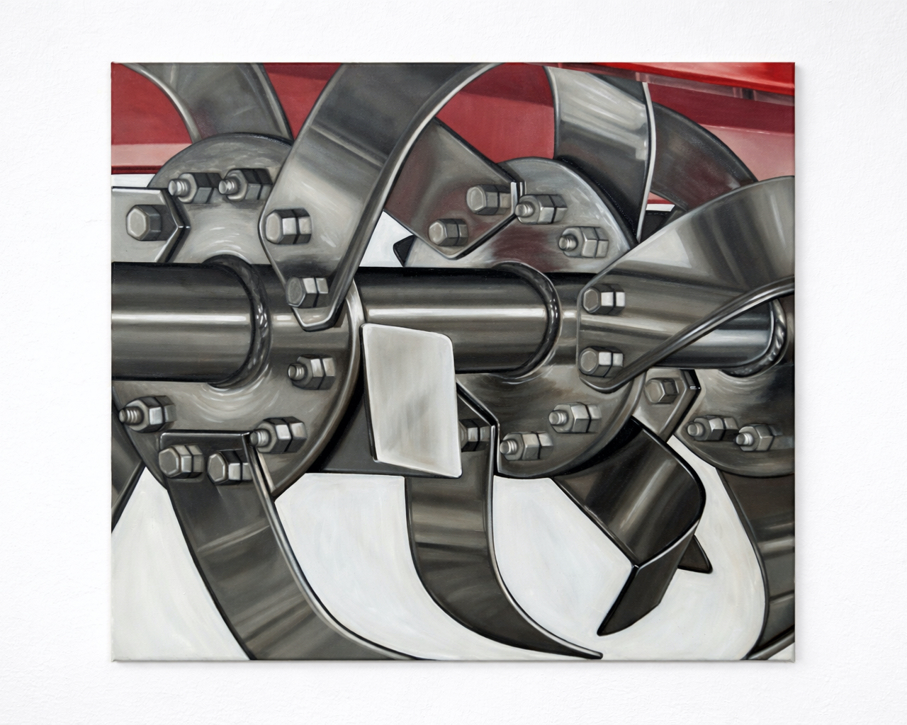 In terms of the content or subject matter of the works in this exhibition, we might again cite Photorealism’s concern with ordinary things (signage, machines, commodities) and everyday scenes. Obrietan’s interest in the quotidian, however, is better framed as a layered engagement with a different realist tendency in twentieth-century American art: the traditional, value-laden images of technological and industrial progress celebrated in the regionalist impulse of American painting of the 1920s and 1930s, particularly the realism of New Deal-era WPA Federal Art Project painting. As with her methodological disruption of Photorealism, Obrietan’s approach again hinges on deliberately skewing or polluting her historical reference point. The close-cropping of Cultivator (2025), for example, produces an uncanny ‘all-over’ image, zoomed-in framing creating an awkward proximity that interferes with the clarity or transparency of the depicted machine. The result is the transformation of an ostensibly realist image into one that is abstract and disorientating to look at. ‘All-over’ painting – long associated with Abstract Expressionism following Pollock’s late 1940s and early 1950s canvases, works that eschewed centrality and balanced relationality in favour of a flattened, wallpaper-like approach covering the entirety of the canvas – historically succeeded New Deal-era Federal Art Project realism. Cultivator therefore collapses two proximal yet oppositional moments in mid-century American painting, amounting to yet another disruptive historical procedure taking place in Obrietan’s painting.